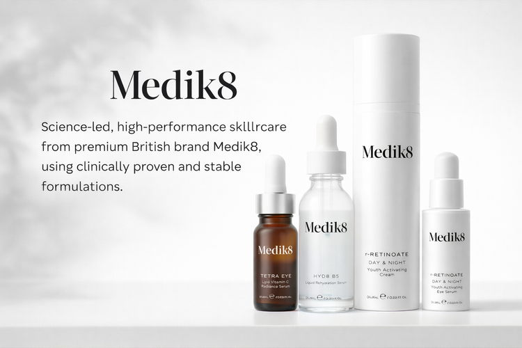 Medik8 is a premium British skincare brand renowned for its science-led approach and clinically proven formulations, combining advanced active ingredients with elegant textures to deliver visible, long-term results. Developed by experts in dermatological research, the brand focuses on high-performance yet gentle skincare suitable for a wide range of skin types and concerns. At the core of Medik8’s philosophy is a simple but powerful routine: vitamin C and sunscreen by day to protect against environmental damage, and vitamin A (retinoids) by night to support skin renewal and repair, helping maintain a healthy, youthful complexion. Medik8 stands out for its use of stable, cutting-edge ingredients, lightweight formulations, and consistent results, all manufactured in the UK with a strong focus on quality and innovation. From brightening serums to advanced anti-ageing treatments and hydration solutions, each product is designed to work synergistically within a complete skincare routine, making Medik8 a trusted global name for effective, results-driven skincare.