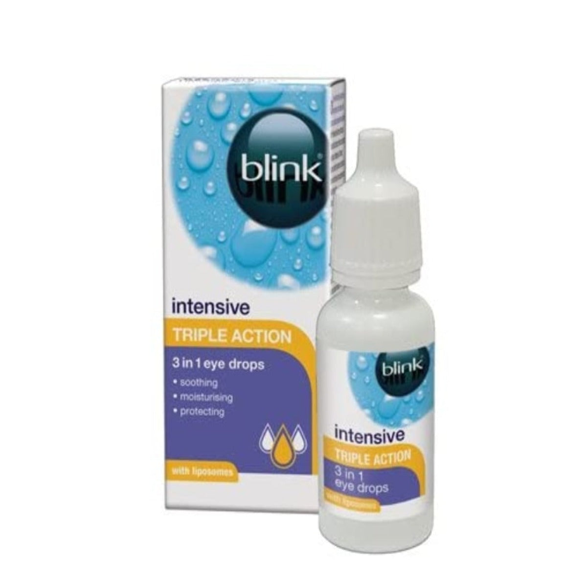 • blink Intensive Triple Action Eye Drops are Formulated to soothe, moisturise and protect dry or irritated eyes. By combining Liposomes, Sodium Hyaluronate and Vitamin E the drops are able to stabilise your tearfilm.