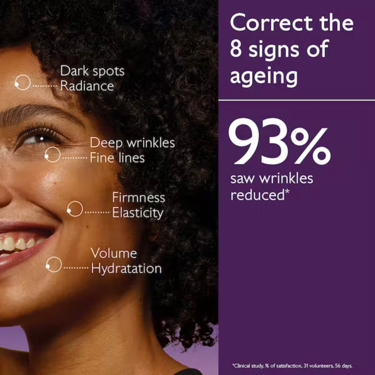 • Wrinkles reduced: 93%*, Fine Line diminished: 87%, Dark spots corrected: 93%, Radiant complexion: 93%, Firmer skin: 97%, Improved elasticity: 96%, More harmonious facial volume: 94%, Hydrated skin: 100%**
