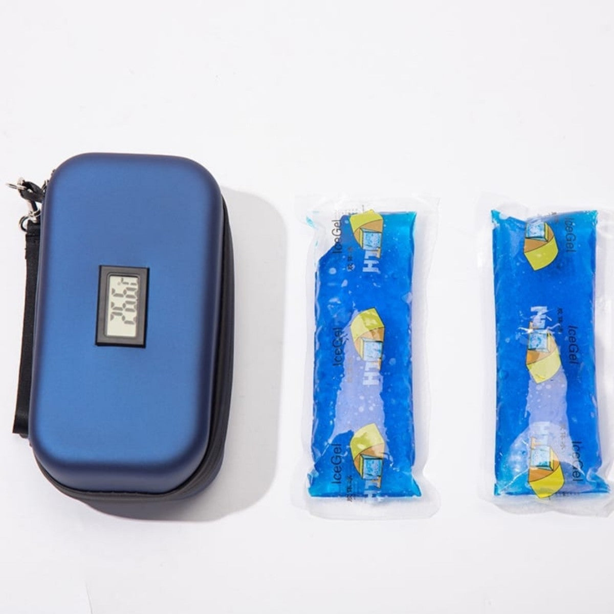 Designed with a hard or semi-hard outer shell for protection, and a soft, insulated interior to maintain the temperature of the insulin. The inside temperature is displayed on a built-in digital thermometer, allowing users to monitor the temperature of their insulin at all times. These cases often have compartments or pockets for storing insulin vials, pens, needles, and other necessary supplies. They come in various sizes and designs to suit different needs and preferences.