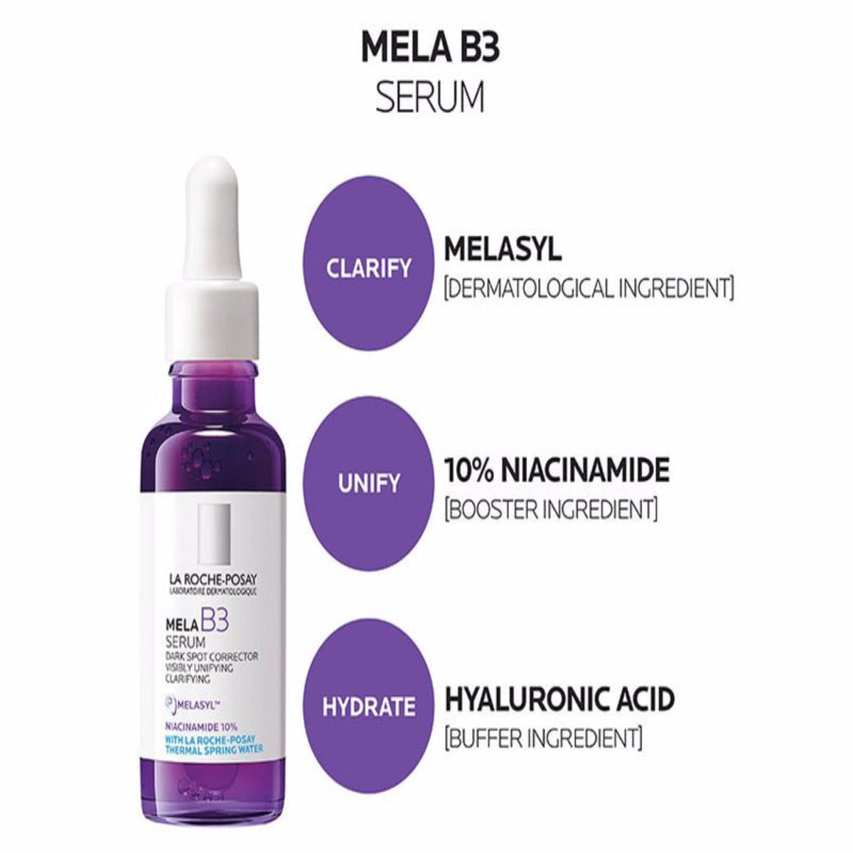 usive La Roche-Posay ingredient, in combination with 10% Niacinamide. A first-of-its-kind discoloration treatment to visibly correct persistent dark spots with long-lasting results, while respecting the natural tone of all skin. Proven on all skin tones.***Based on a consumer study on 23,000 people to understand pigmentary disorders and its impact on quality of life.**Based on an 8 week study on 72 women of all skin phototypesHow to use:For daily usage.Apply morning and/or evening to face and neck before moisturising. If needed, suitable for use on hands.In the morning, use Mela B3 UV Daily Moisturiser SPF 30 as the last stepIngredients:Melasyl: New, exclusive multi-patented La Roche-Posay ingredient that visibly reduces persistent dark spots with long-lasting results. Targets discoloration while respecting the natural tone of all skin. Born from 18 years of research.Niacinamide: A form of vitamin B3, niacinamide is a water soluble vitamin. It is widely used in dermatology and is known for its ability to help visibly fade skin discoloration. Melasyl and Niacinamide work together to help visibly correct even stubborn dark spotsThermal Spring Water:A soothing water sourced in the town of La Roche-Posay in France and a core ingredient in most of our products. It contains a unique combination of minerals, trace elements, and a high concentration of selenium, a natural antioxidant. Aqua / Water / Eau Dimethicone Niacinamide Glycerin Propylene Glycol Polysilicone-11 Silica Bis-Peg/Ppg-16/16 Peg/Ppg-16/16 Dimethicone Cystoseira Tamariscifolia Extract 2-Mercaptonicotinoyl Glycine Peg-20 Methyl Glucose Sesquistearate Sodium Hyaluronate Sodium Hydroxide Sodium Thiosulfate Carnosine Poloxamer 338 Ammonium Polyacryloyldimethyl Taurate Dipotassium Glycyrrhizate Caprylic/Capric Triglyceride Capryloyl Salicylic Acid Caprylyl Glycol Citric Acid Trisodium Ethylenediamine Disuccinate Xanthan Gum Pentylene Glycol Octyldodecanol Retinyl Palmitate Tocopherol Pentaerythrityl Tetra-Di-T-Butyl Hydroxyhydrocinnamate Phenoxyethanol Ci 17200 / Red 33 Parfum / FragranceLa Roche Posay - Mela B3 Dark Spot Serum With Melasyl + Niacinamide 30ml Born from research on 23,000 people.* This anti-aging serum visibly reduces a range of skin discoloration, including sunspots, age spots, post-acne marks (or post-inflammatory hyperpigmentation), and even the most stubborn dark spots. Powered byLa Roche Posay - Mela B3 Dark Spot Serum With Melasyl + Niacinamide 30ml Born from research on 23,000 people.* This anti-aging serum visibly reduces a range of skin discoloration, including sunspots, age spots, post-acne marks (or post-inflammatory hyperpigmentation), and even the most stubborn dark spots. Powered by Melasyl, the newest, exclusive La Roche-Posay ingredient, in combination with 10% Niacinamide. A first-of-its-kind discoloration treatment to visibly correct persistent dark spots with long-lasting results, while respecting the natural tone of all skin. Proven on all skin tones.** *Based on a consumer study on 23,000 people to understand pigmentary disorders and its impact on quality of life.**Based on an 8 week study on 72 women of all skin phototypes How to use: For daily usage. Apply morning and/or evening to face and neck before moisturising. If needed, suitable for use on hands.