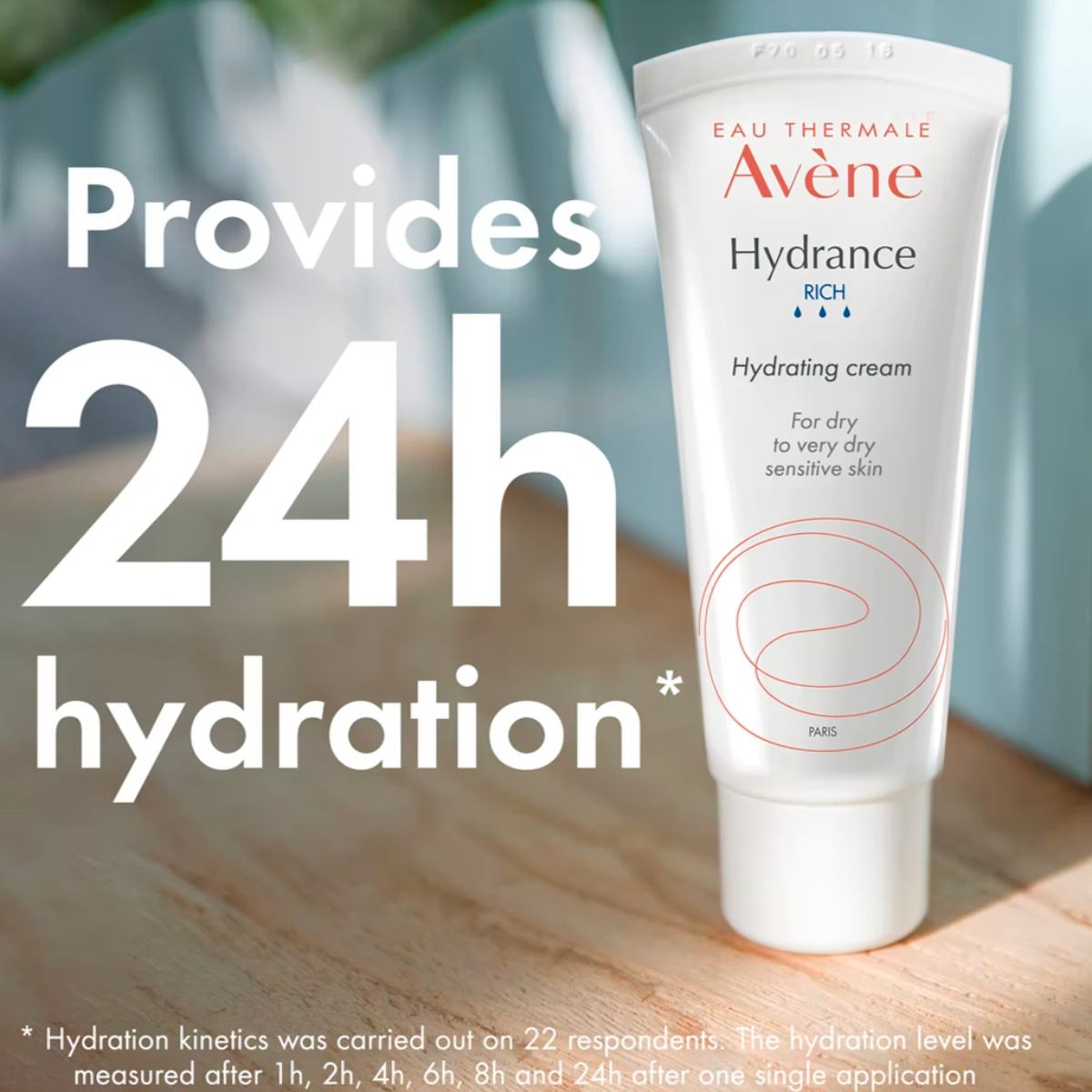 "• HYDRATES continuously for 24 hours. The action of Hydrance RICH Hydrating Cream's hydrating and patented* Cohederm active ingredient ensures optimal diffusion of Avène Thermal Spring Water. • SOFTENS: This hydrating cream with a subtle fresh scent, softens and soothes the skin thanks to Avène Thermal Spring Water. • COMFORTS: Its rich, non-greasy texture quenches the skin's thirst all day long and restores suppleness and freshness."