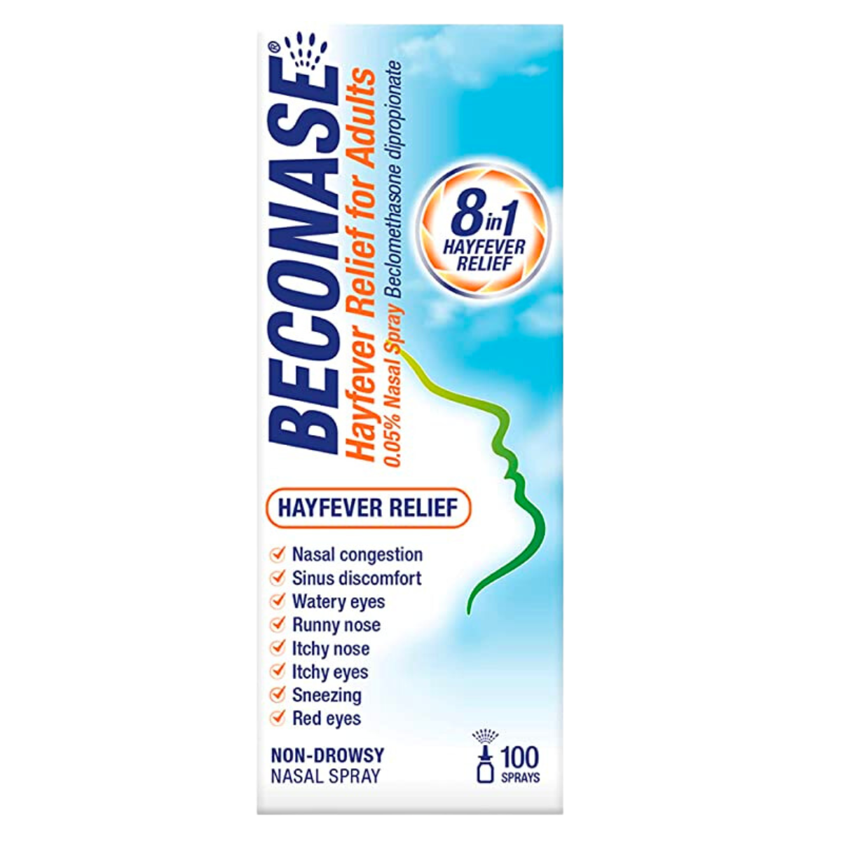 Beconase hay fever Relief nasal spray for adults is a highly effective medication for treating hay fever. Unlike tablets, it works right where the problem starts, in the nose. It contains belcometasone and has an anti-inflammatory action which quickly starts to reduce inflammation and swelling in the nose. The product brings relief from allergy symptoms such as: Nasal congestion, watery eyes, runny nose, sneezing, itchy eyes, itchy nose, red eyes and sinus discomfort.