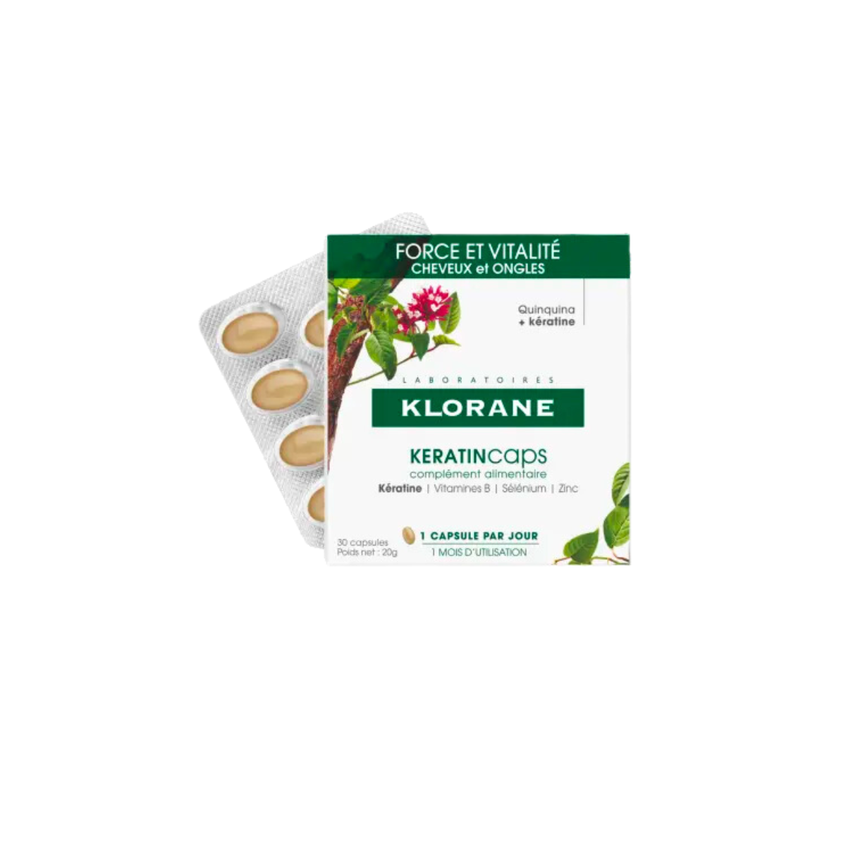 The Klorane KERATIN caps is the optimal food supplement to maintain healthy, beautiful, strong hair. The formula, made up of Keratin, Vitamins, Zinc and Selenium, nourishes the hair bulb. It supports fuller, thicker shinier looking hair and nails.