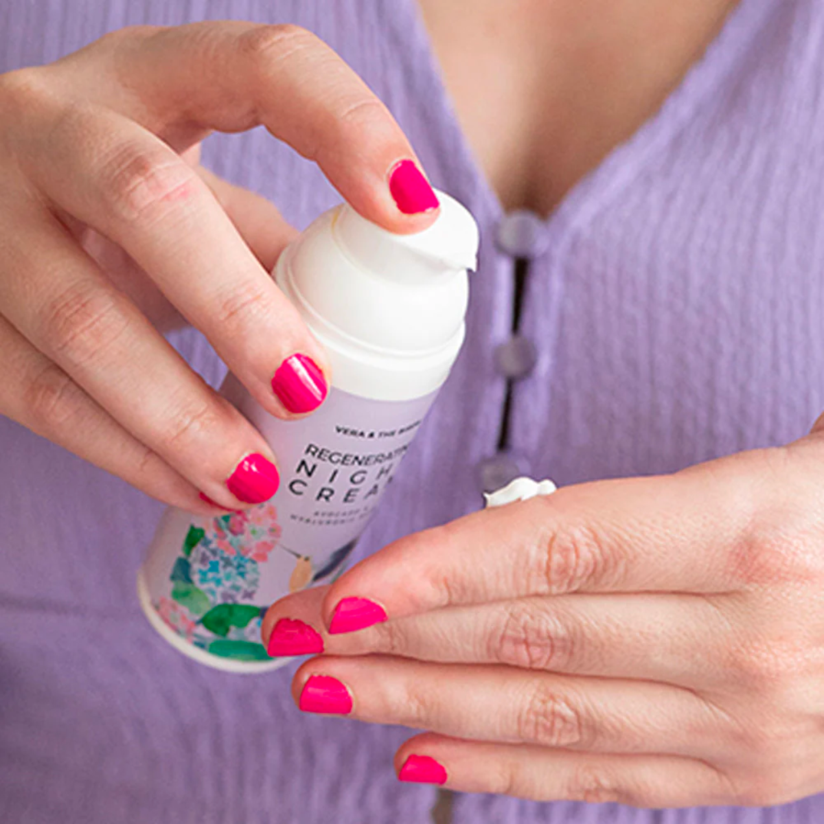 Regenerating Night Cream is packed with powerful active ingredients that regenerate your skin while you sleep. Its exclusive blend of fatty acids, obtained from avocado oil, olive oil and sweet almond oil, help to profoundly regenerate your skin, while the hyaluronic acid retains the natural moisture of the epidermis and smooths out fine lines.